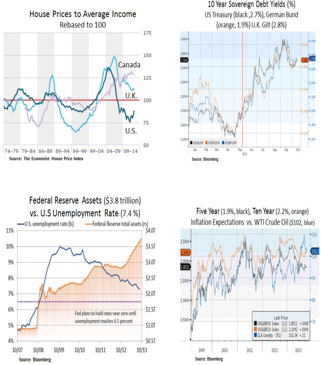 Financial markets continue to display resilience despite indecision in Washington over the Federal debt ceiling extension and the 2014 fiscal budget. Political gridlock will likely continue to frustrate investors in the short-term and its chronic nature undermines U.S. credibility in the sovereign debt markets. However, unlike the 2011 fiscal impasse, the budget deficit has witnessed material cyclical improvement in 2013. Thus, we expect politicians to follow the path of least resistance i.e. a continuing resolution and a debt ceiling extension. Moreover, they will likely agree to a negotiating framework over the medium-term in order to reach a final fiscal resolution over the 2014 budget. Protracted fiscal negotiations and labor market uncertainty will likely keep the Federal Reserve and its new head Janet Yellen on the defensive. Therefore, the Fed’s ‘tapering’ of its quantitative easing (QE) program will likely become a Q1 2014 affair. From our investment perspective, we continue to focus on low duration non-agency MBS and selected equities that offer a balance of income growth and earnings visibility.